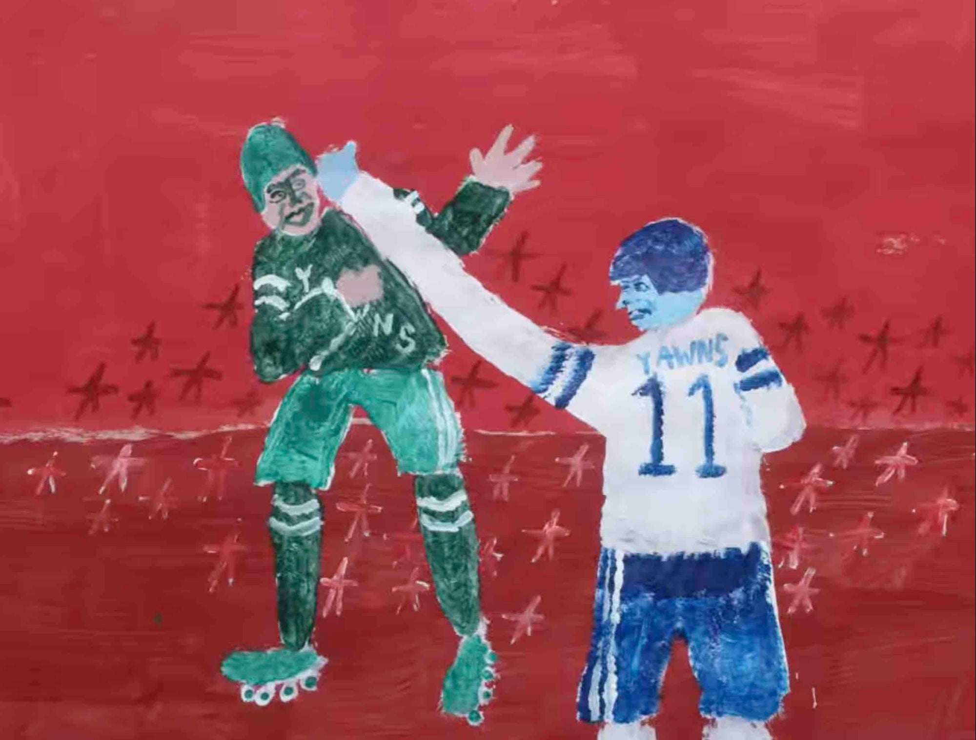 Andrews remains active on the DIY circuit he’s traveled for almost 20 years now, taking his solo shows on the road to backyards and unconventional spaces, projecting his signature handmade animations, which dance behind him. He sells his artwork for cheap, guided by the Bread & Puppet Theater manifesto that art should belong to everyone who wants it, and those paintings funded this album. He’s long admired Little Wings, an artist cut from the same well-worn cloth. After flipping through Kyle Field’s work at a Baby’s All Right show, he asked him to paint the cover; two shaky hockey players clad in 1980’s New Jersey Devils red and green watercolor.